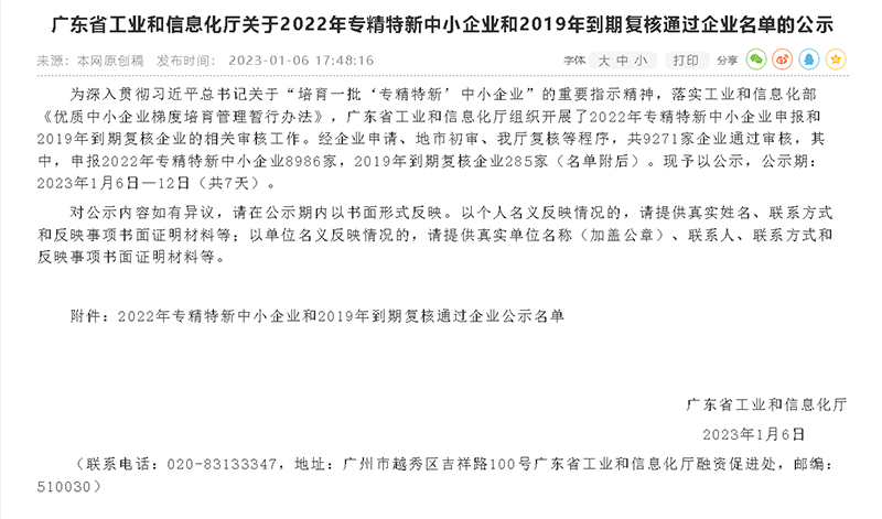 2023年1月6日,華頡科技成功通過廣東省工業和信息化廳公示,榮獲“專精特新中小企業”認定。這一榮譽彰顯了華頡科技在高新技術領域的領先地位,也是對公司長期堅持創新驅動發展戰略、深化技術創新和產品研發的肯定。