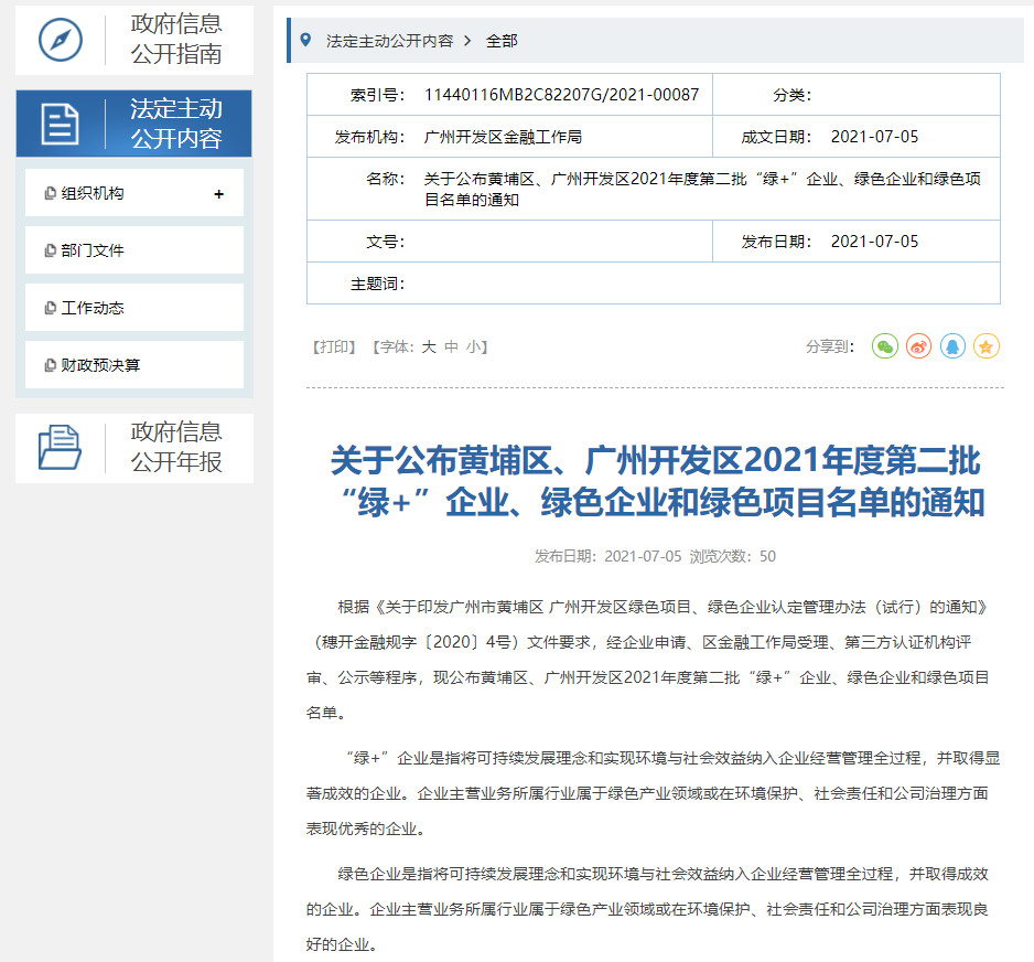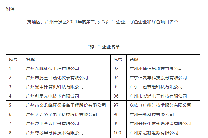 根據《關于印發廣州市黃埔區 廣州開發區綠色項目、綠色企業認定管理辦法(試行)的通知》(穗開金融規字〔2020〕4號)文件要求,經企業申請、區金融工作局受理、第三方認證機構評審、公示等程序,現公布黃埔區、廣州開發區2021年度第二批“綠+”企業、綠色企業和綠色項目名單。