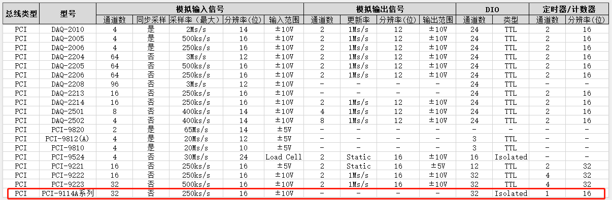 PCI-9114DG:32通道16位100 kS/s正常增益多功能DAQ卡 PCI-9114HG:32通道16位100 kS/s高增益多功能DAQ卡 PCI-9114A-DG:32通道16位250 kS/s正常增益多功能DAQ卡 PCI-9114A-HG:32通道16位250 kS/s高增益多功能DAQ卡 |