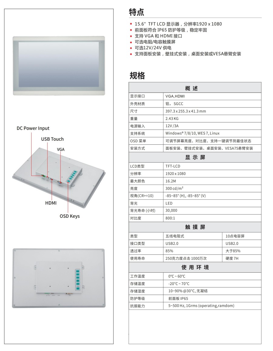 華頡科技15.6'' 工業(yè)觸摸顯示器